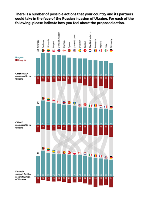 Most citizens of Western or Western-allied nations agree that their government should financially support the reconstruction of Ukraine and that the country should be allowed to join the European Union and Nato, according to a 14-nation survey.