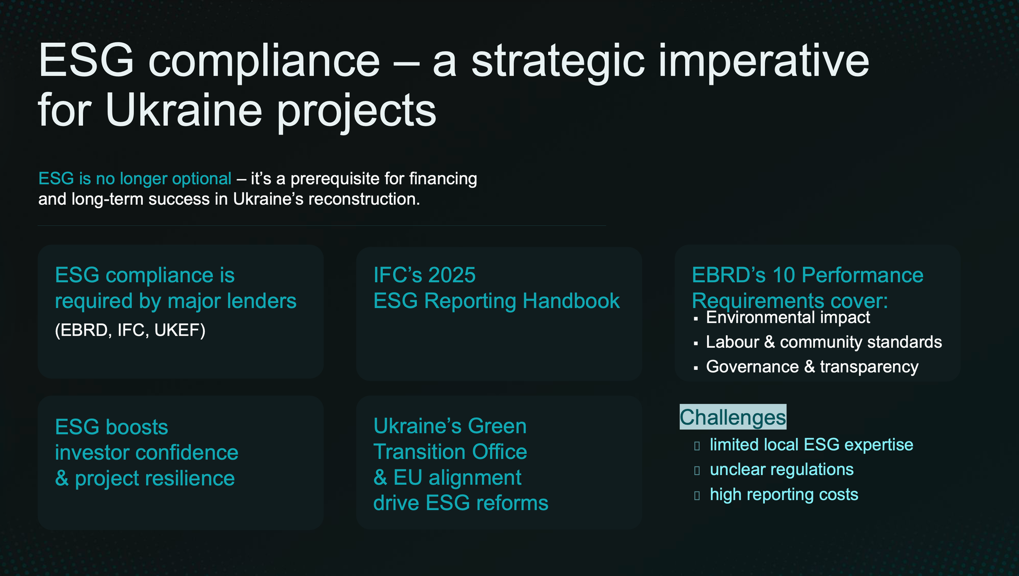 Petrov said large international lenders apply ESG requirements consistently, and Ukrainian banks are increasingly aligning with those standards. He also warned foreign companies that compliance failures can carry cross-border legal risks, citing the extraterritorial reach of the UK Bribery Act.