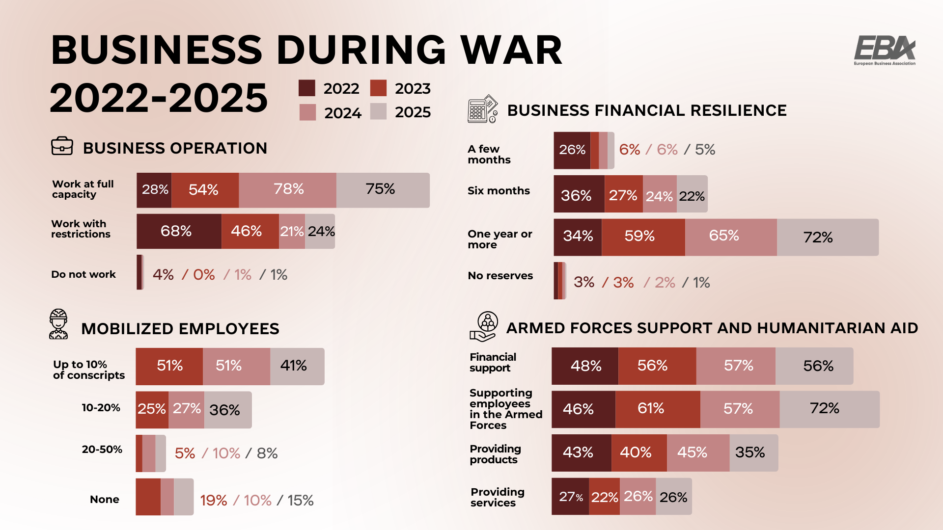 The percentage of executives at European businesses operating in Ukraine who say their business has a positive outlook has jumped to 40% from 27% over the past six months, according to a survey by the Kyiv-based European Business Association (EBA).